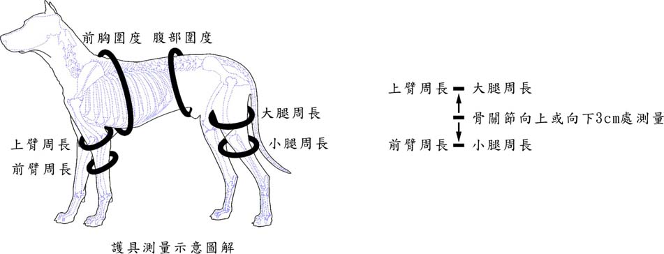 產品編號 CODE 尺寸 SIZE 大腿周長 UPPER LEG GIRTH 小腿周長 LOWER LEG GIRTH 中型犬 MEDIUM-STYLE DOGS T-26703 S 22-28cm 10-14cm T-26705 M 28-36cm 14-19cm T-26707 L 36-44cm 19-24cm 產品編號 CODE 尺寸 SIZE 大腿周長 UPPER LEG GIRTH 小腿周長 LOWER LEG GIRTH 小型犬、貓 SMALL-STYLE DOGS, CATS T-26712 XS 9-13cm 6-8cm T-26713 S 13-17cm 7-9cm T-26715 M 16-20cm 8-10cm T-26717 L 20-25cm 10-12cm -