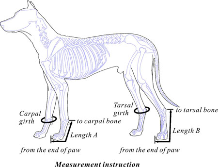 Code Size Tarsal girth Splint length medium-style dogs T-30402 XS 10-12cm 16cm T-30403 S 12-14cm 18cm T-30405 M 14-16cm 21cm T-30407 L 16-18cm 24cm T-30408 XL 18-20cm 25cm